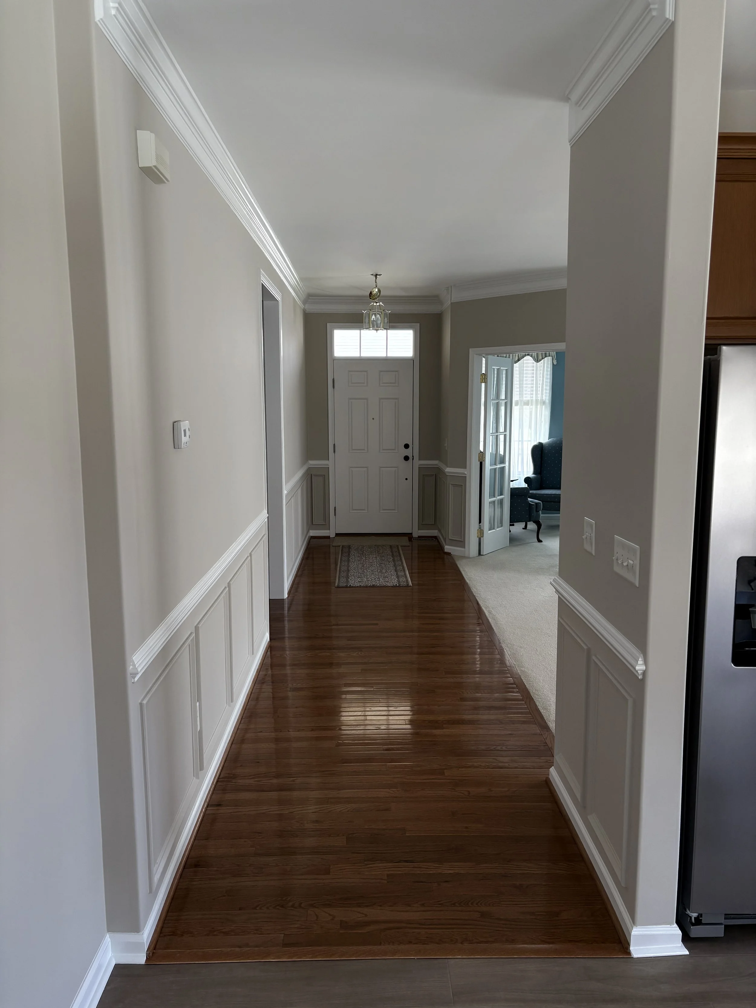 A beautifully refreshed hallway featuring clean, neutral wall tones paired with crisp white trim for a timeless and elegant look. The smooth, even paint finish enhances the natural light flowing through the space, highlighting the detailed crown molding, chair rail, and wainscoting. Sharp, precise lines between the walls and trim showcase the craftsmanship and attention to detail throughout the project. Complemented by rich hardwood floors, this entryway feels warm, inviting, and polished—demonstrating how professional painting can elevate the overall look and feel of a home’s main living spaces.
