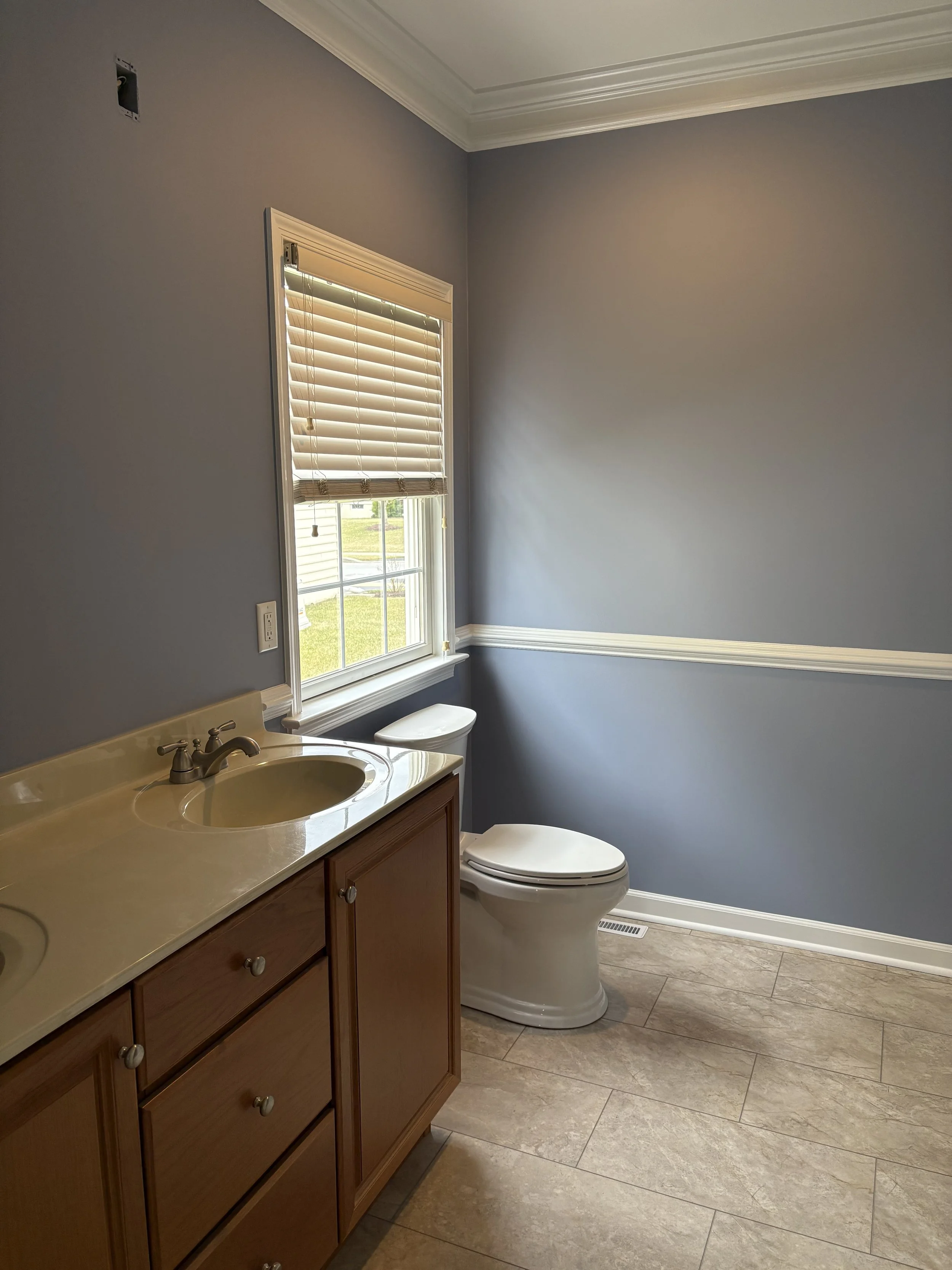 A clean, freshly painted bathroom featuring smooth, even coverage in a soft purple-gray tone that gives the space a calm and modern feel. Natural light from the window highlights the flawless finish on the walls, showcasing sharp cut lines along the crown molding, chair rail, and trim. The crisp white accents around the window and fixtures contrast beautifully with the wall color, while the warm wood vanity adds balance and warmth. Centered around the sink and toilet, this project highlights the impact of precise, professional painting in elevating an everyday space into something bright, polished, and inviting.