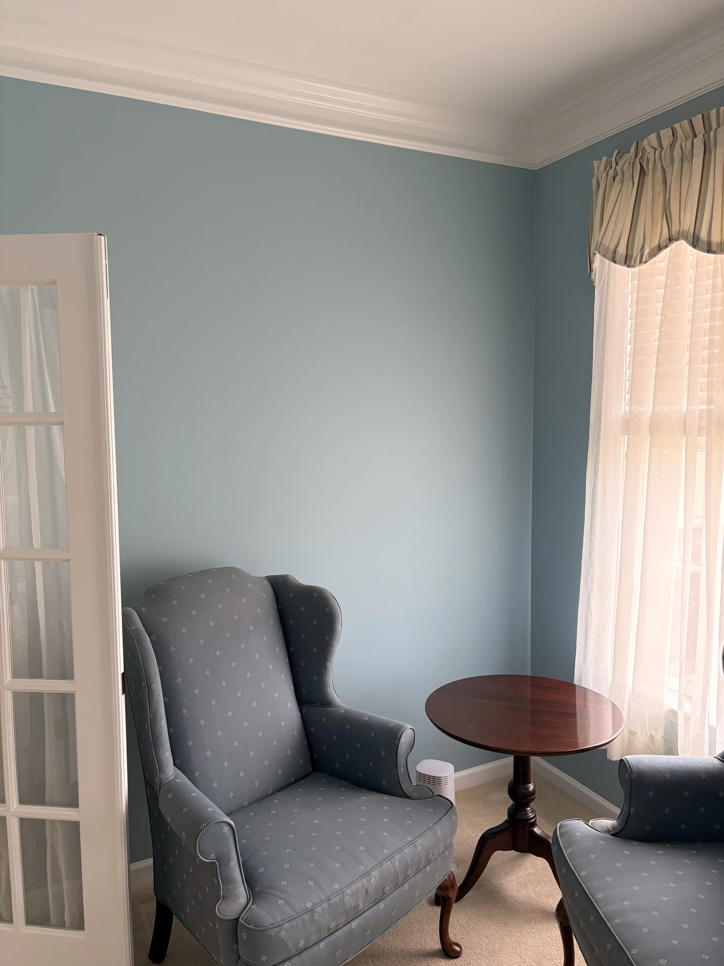 A cozy, freshly painted sitting area featuring soft blue walls that create a calm and inviting atmosphere. The smooth, even finish is highlighted by natural light streaming through the window, enhancing the richness and consistency of the color. Crisp white crown molding and trim provide a clean contrast, showcasing sharp, professional lines and attention to detail. Paired with comfortable seating and warm wood accents, this space demonstrates how a high-quality paint job can transform a room into a relaxing and elegant retreat.